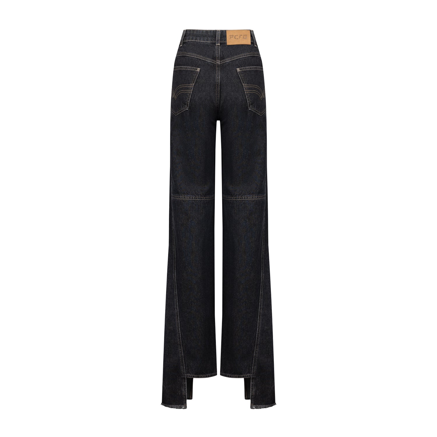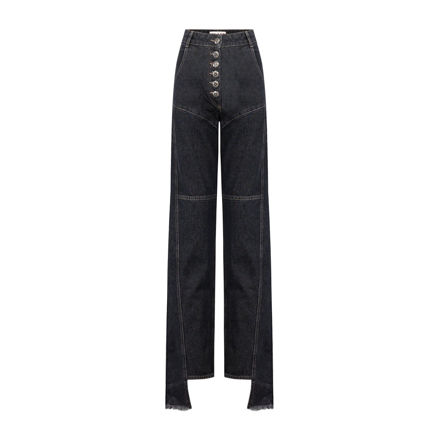 TROUSERS WITH BUTTON DETAIL AT THE FRONT AND ASYMMETRICAL STITCHING DETAIL AT THE HEM.
