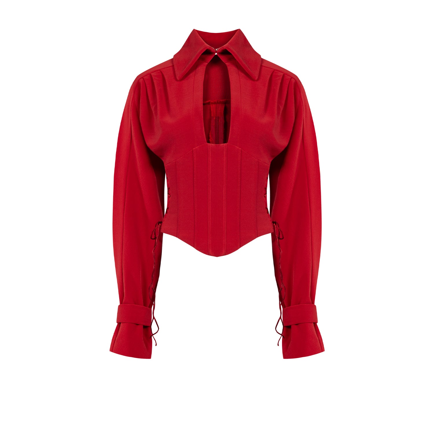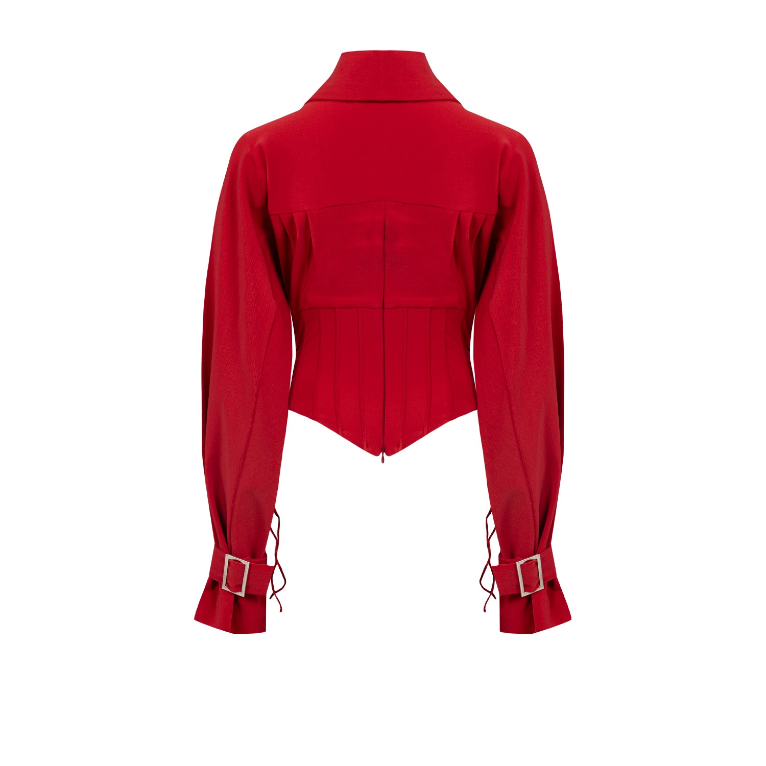 Blouse with collar detail, belt detail on sleeves, and corseted bodice.