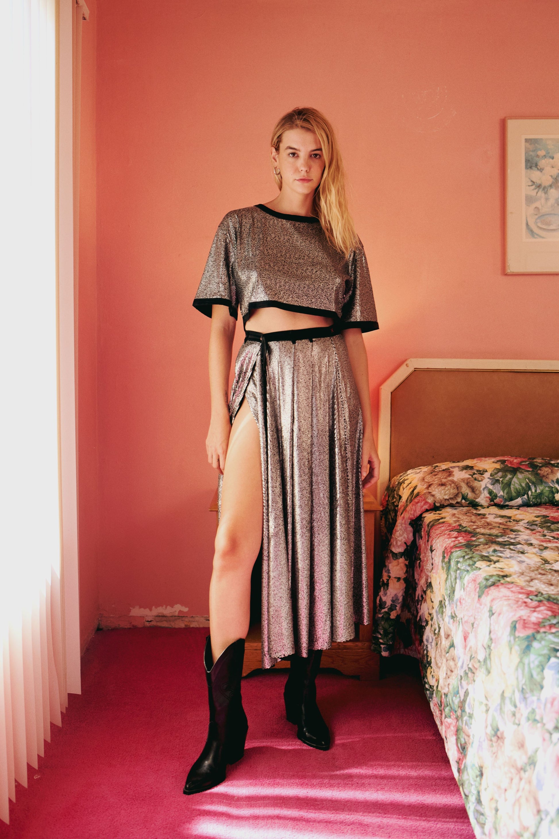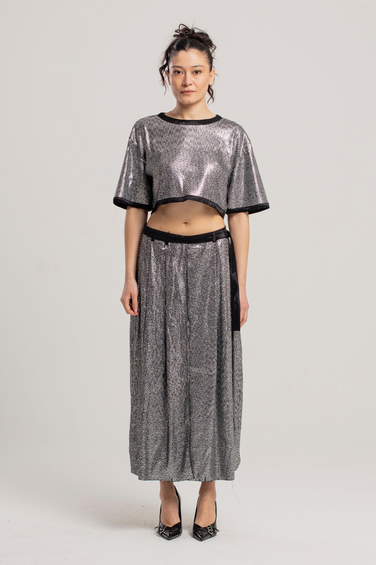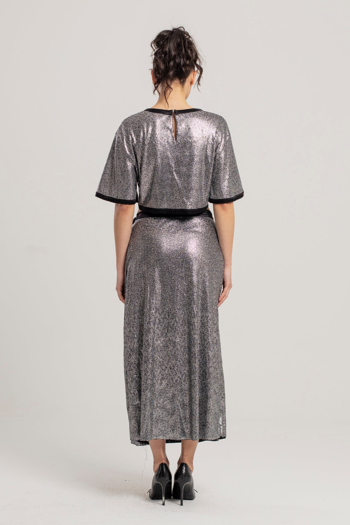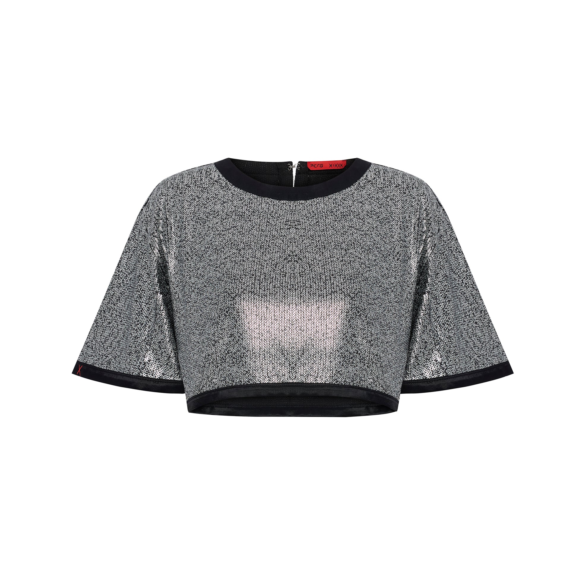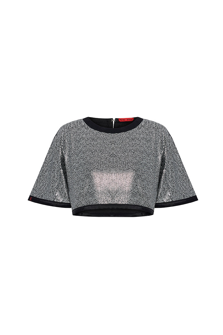 Bu payet üst, göz alıcı bir ışıltı yaratan parlak payetlerle süslenmiştir. Kısa kesimi modern ve trend bir görünüm sunarken, payet işlemeleri tasarıma ekstra ışıltı ve glam bir etki katar. Partilerde veya özel etkinliklerde iddialı bir stil yaratmak için mükemmel olan bu top, şıklığı ve parıltıyı zahmetsizce bir araya getirir.