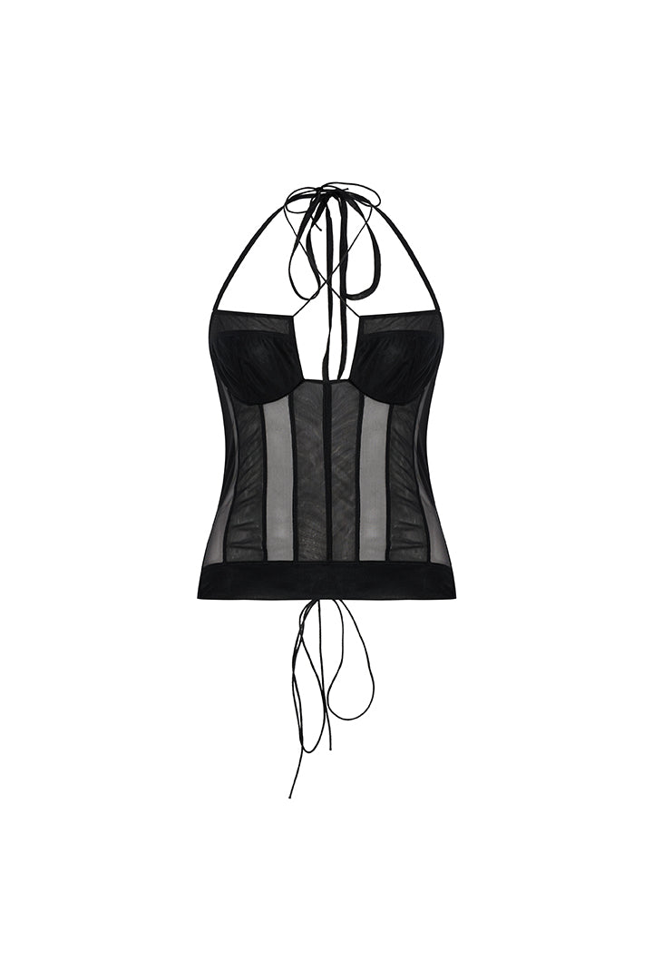 Bu şık üst, hafif ve hava alan bir his sunan transparan tülden üretilmiştir. Üzerindeki stil sahibi kafes detayı, tasarıma özgün ve sofistike bir dokunuş ekler. Transparan tül yapısı, zarif bir katmanlı görünüm oluşturarak her kombine göz alıcı bir ışıltı katmak için mükemmel bir seçenek sunar.