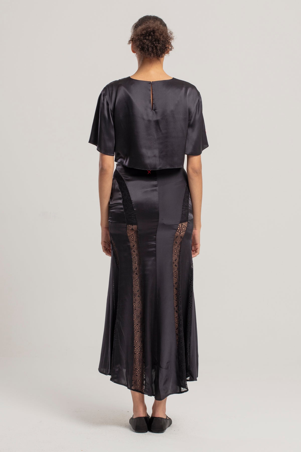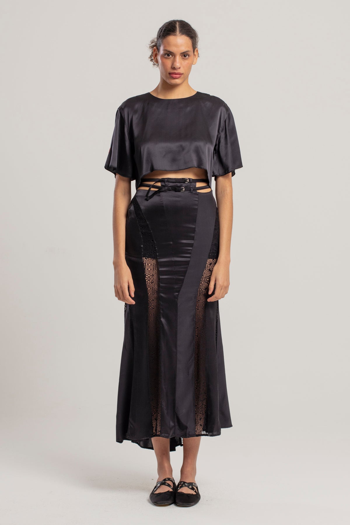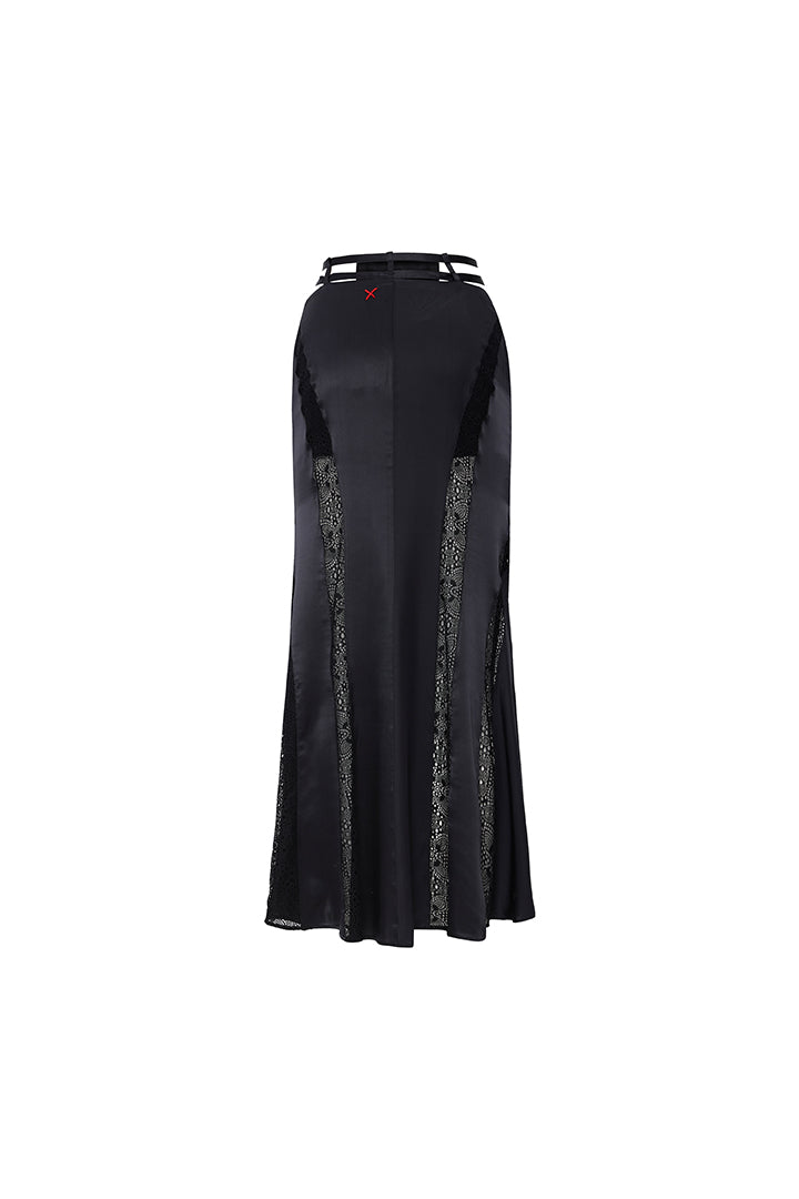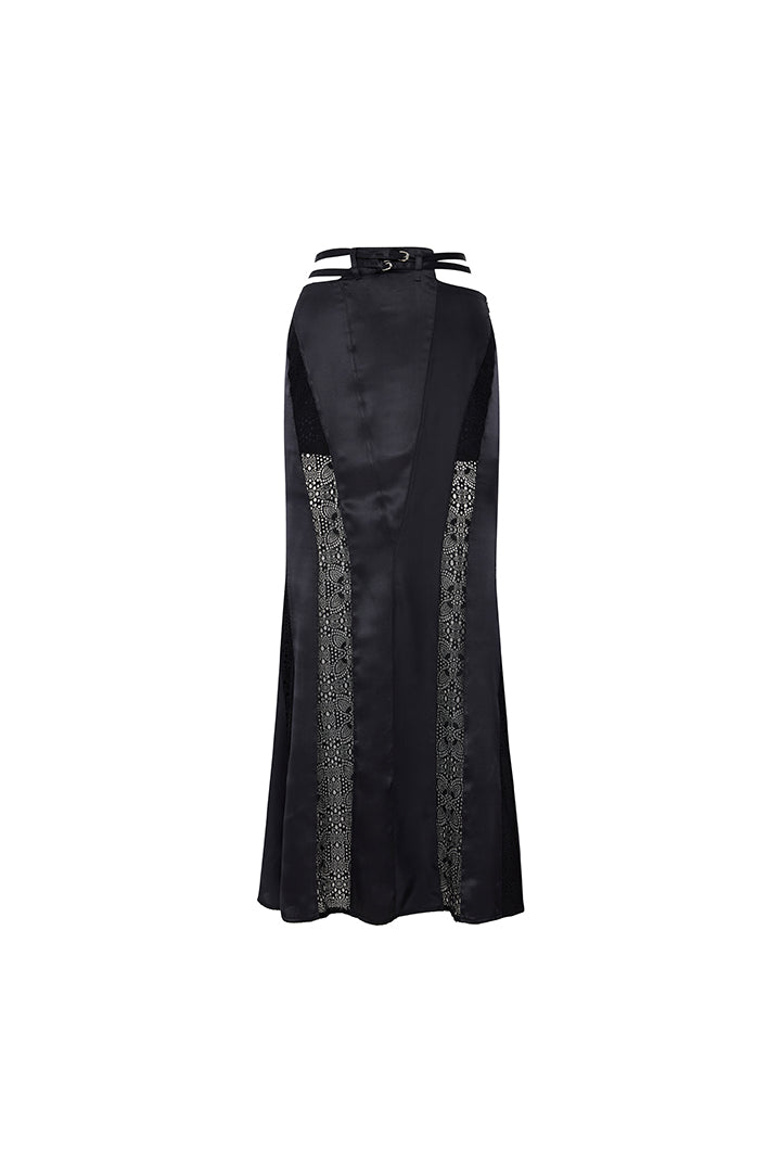 Bu zarif uzun ipek etek, akıcı ve lüks dokusuyla zarif bir hareket sağlar. Bel kısmını incelten hassas dantel kemer detayı, tasarıma sofistike ve etkileyici bir zarafet katar. İpeğin pürüzsüz dokusu ile dantelin ince işçiliği birleşerek feminen ve rafine bir görünüm yaratır. Hem resmi davetler hem de şık özel etkinlikler için mükemmel bir seçenektir.