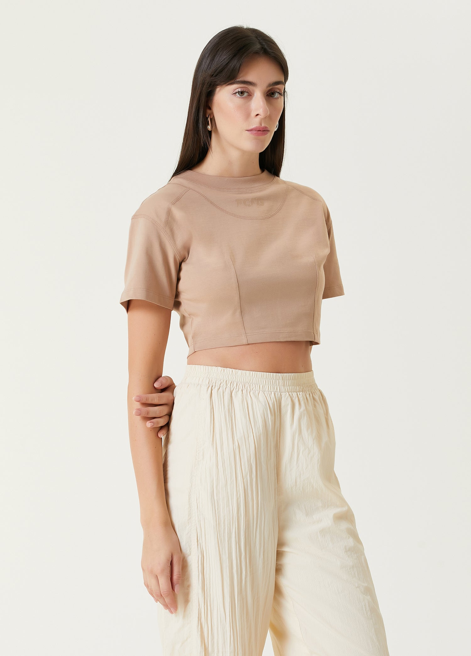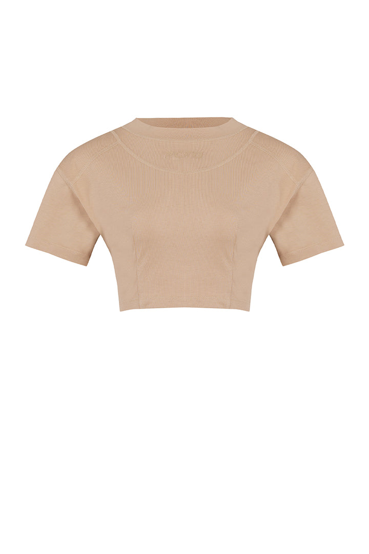 Bu zarif crop tişört, doğal formunuzu öne çıkaran şık ve vücuda oturan bir siluet sunar.
